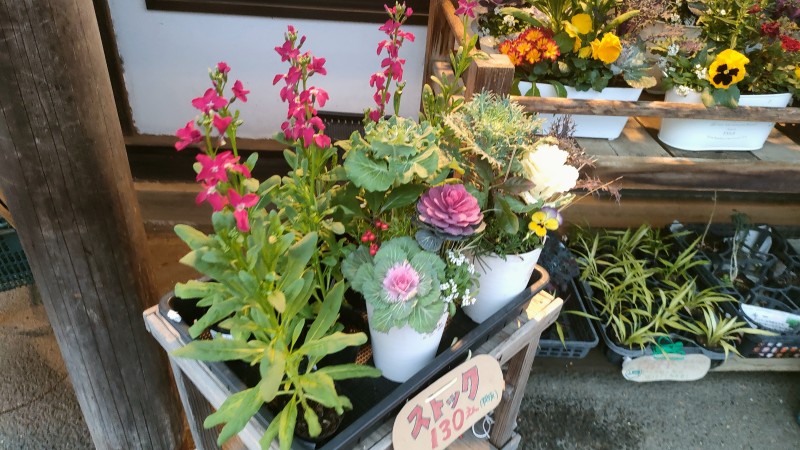 軒下でお花や苗木なども販売しています。