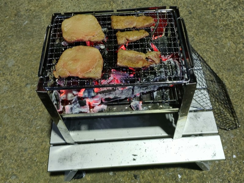 ちなみにキャプテンスタッグのアルミロールテーブルの上にカマド スマートグリルをのせて使っています。