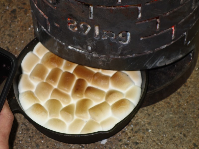 下のカマ部でピザ、焼芋、スモアを調理と実験的に上下同時調理をしています。